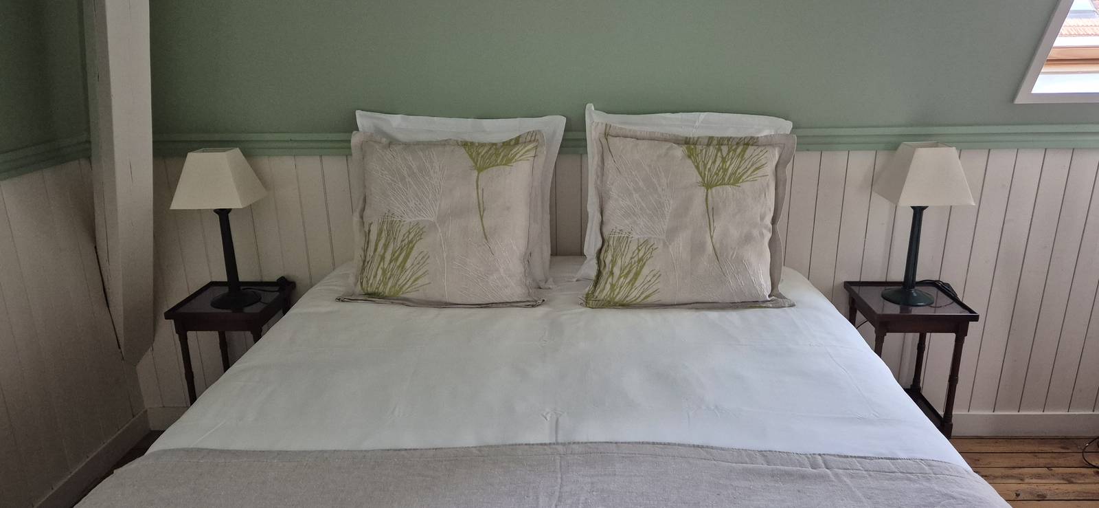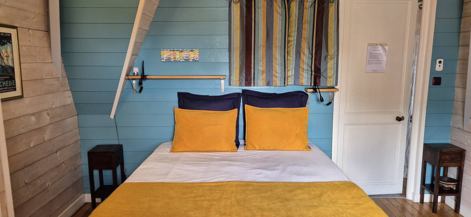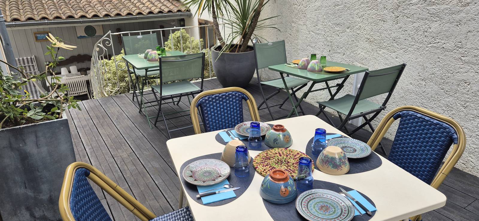 En el Clos Bleu en La Rochelle, cada una de las habitaciones tienen un color dominante diferente y las hemos decorado prefiriendo la calidez de la madera y los muebles familiares o antigüedades encontrados en los mercados de pulgas cercanos. Tienen ropa de cama de alta calidad con un edredón. Todas las habitaciones dan a las terrazas este u oeste de la casa. Cada baño está equipado con una ducha y un WC privados.